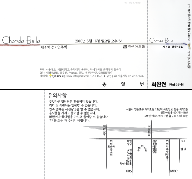작년에 지인의 부탁으로 만든 포스터입니다. 예, 저는 프로가 아니어서 어쩌다 한 작업입니다... 다행히 연주자들은 마음에 들어했답니다. 특히 좋아했던 것이 가운데 줄인데요, 바이올린 줄을 직접 스캔한 것입니다, 음악 쪽 분들이 아니면 뭔지 모를 수도 있다는... ^^;;