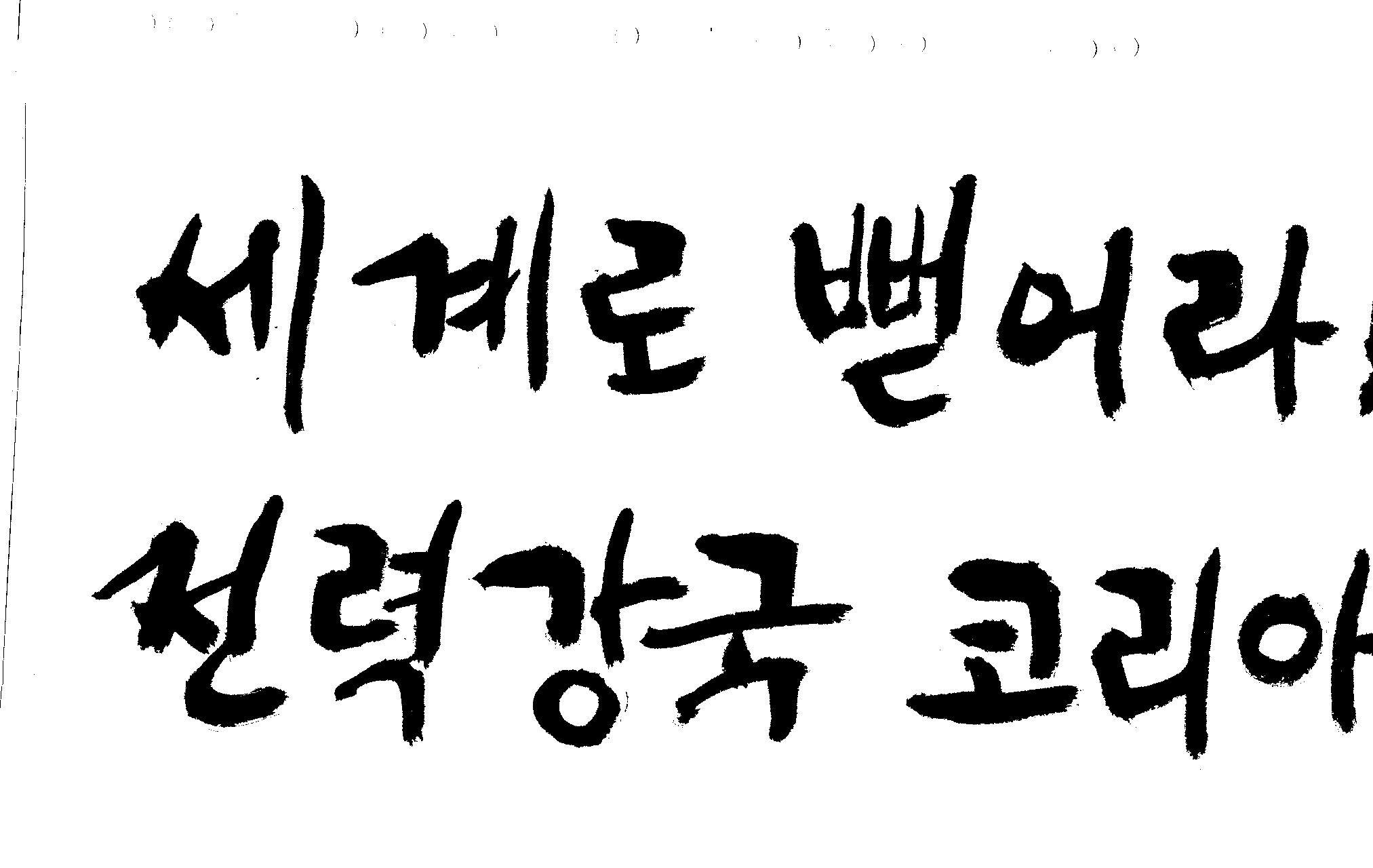 캘리 좀 부탁드려요!~ 김철호 일반 1 12522 2008.12.24 12:08 > > 전력회사 신문광고를 하는데요 캘리로 멋지게 하고픈데 > 캘리프로그램으로 아무리 써도 느낌이 안나옵니다 ㅜ.ㅜ > 이런걸 부탁한다는 자체가 너무나도 염치없지만 부탁드립니다. > > 세계로 뻗어라! 전력강국 코리아 > 보기는 쉬워도 하기는 어려운게 세상 모든 일 일겁니다. 그중에 캘리그라피가 그런것 일 겁니다... 스캔중에 글꼴이 잘린것은 서로다른글꼴서 편집하시길... 글수가 많아서 어쩔 수없네요...
