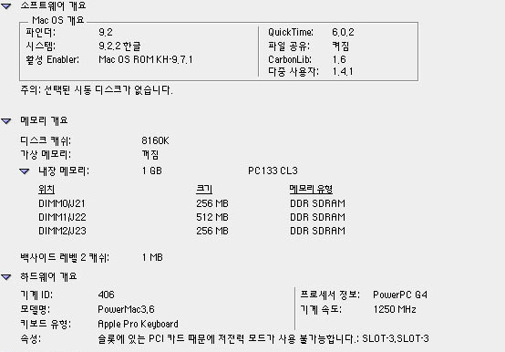 OS 9로 부팅이 되는 마지막 기종이네요. G4/1.25싱글이고요. G4중에서는 가장 좋은 기종입니다. 메모리만 512MB를 더추가해서 1.5GB로 하시고 각각에 프로그램마다 사용메모리를 충분이 올려주시면 될듯 합니다. 쿽3.3을 사용하셔야 되고요. 쿽4.1은 정품 쿽키가 잇어야만 사용이 가능합니다. ================== 도움이 필요하시면 베스트맥(A/S,판매)를 클릭하고 자기소개를 참고하세요
